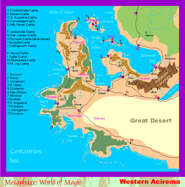The most western portion of Acirema is ruled by the League of Five Nations, a loose confederation of the five major cities and tribes in that area. This region encompasses the cities of Plymouth, Boston, St Mary's, Jamestown, and Charleston. Hilly regions divide the area up into pocket environments some of which suffer the hot blasts of the Great Desert, others the cooling breezes off the surrounding oceans.